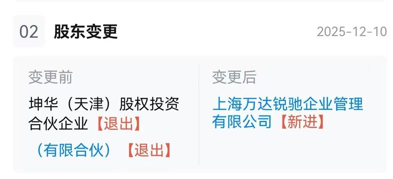 新京报贝壳财经讯(记者段文平)万达近期再次“赎回”旗下商业项目。天眼查信息显示,12月10日,南京万达茂投资有限公司发生工商变更,股东坤华(天津)股权投资合伙企业(有限合伙)退出,上海万达锐驰企业管理有限公司成为全资股东。