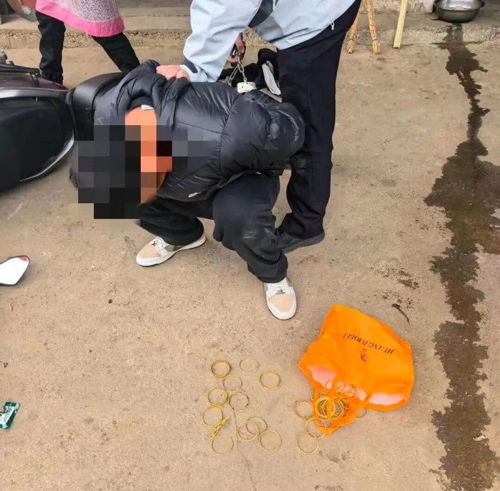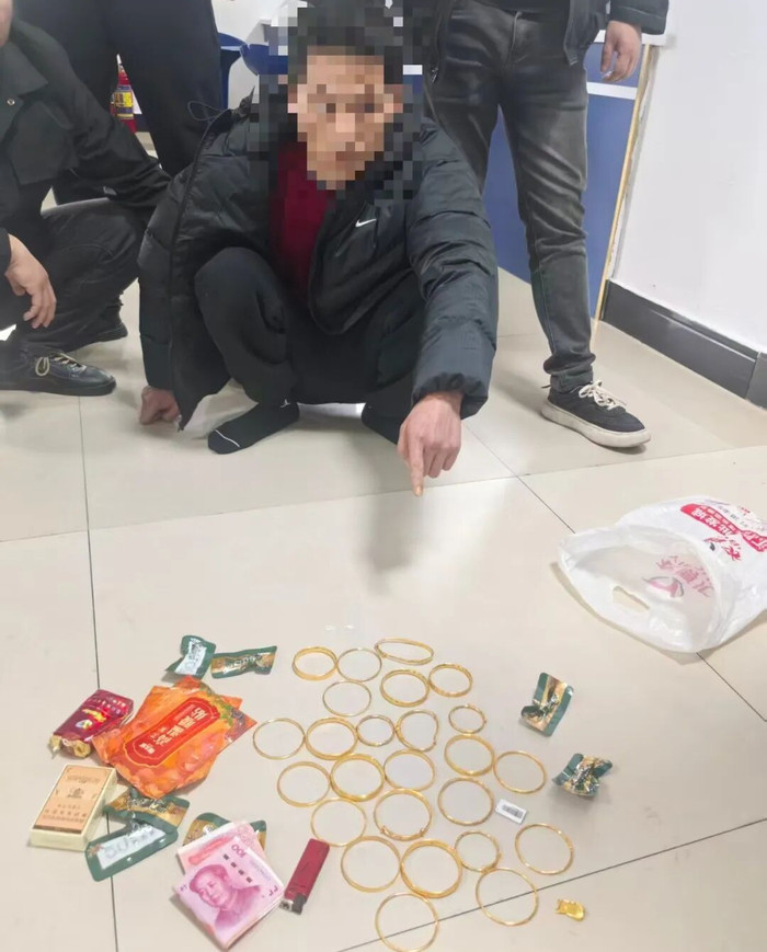 21日凌晨,办案民警火速奔赴湖北省赤壁市。在湖北警方的协助下,于当日中午将正在分赃后准备逃窜的犯罪嫌疑人谢某、金某一举抓获,现场查获尚未销赃的黄金手镯55件、已被嫌疑人熔化的黄金1坨。
