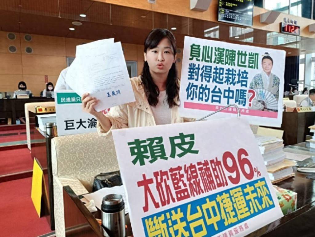 海峡导报综合报道 台中市议会26日定期会,国民党市议员黄佳恬痛批,台中捷运(地铁)蓝线建设,台当局应补助42亿元(新台币配资栈,下同),却在最后拍板时仅核定1.68亿元,等同断绝台中市民对交通建设的期待。黄佳恬左批台湾地区领导人赖清德是“赖皮”,右打台交通部门负责人陈世凯忘恩负义成“台中陈世美”。